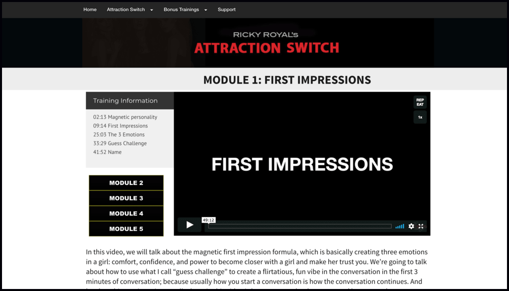That's why after every module where you're going to learn the attraction concepts, flirting techniques, how women think and how they feel attraction, we will give you a step-by-step action plan of what you need to do in order to start naturally applying these techniques whenever you are around women or texting with them.